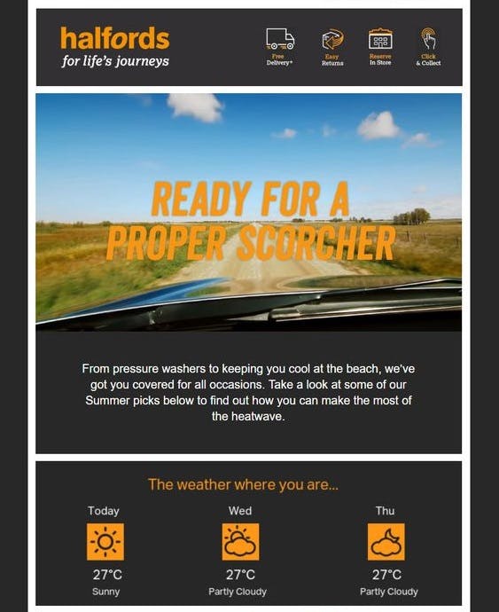 Halfords is one retailer leveraging the weather well within email campaigns, helping its subscribers make the most of a heatwave. Not only does the retailer display the upcoming weather forecast for the subscriber’s location at the moment the email is opened, but it offers inspiration on things to do during the warmer weather – such as beach trips and camping – and product recommendations related to these activities.